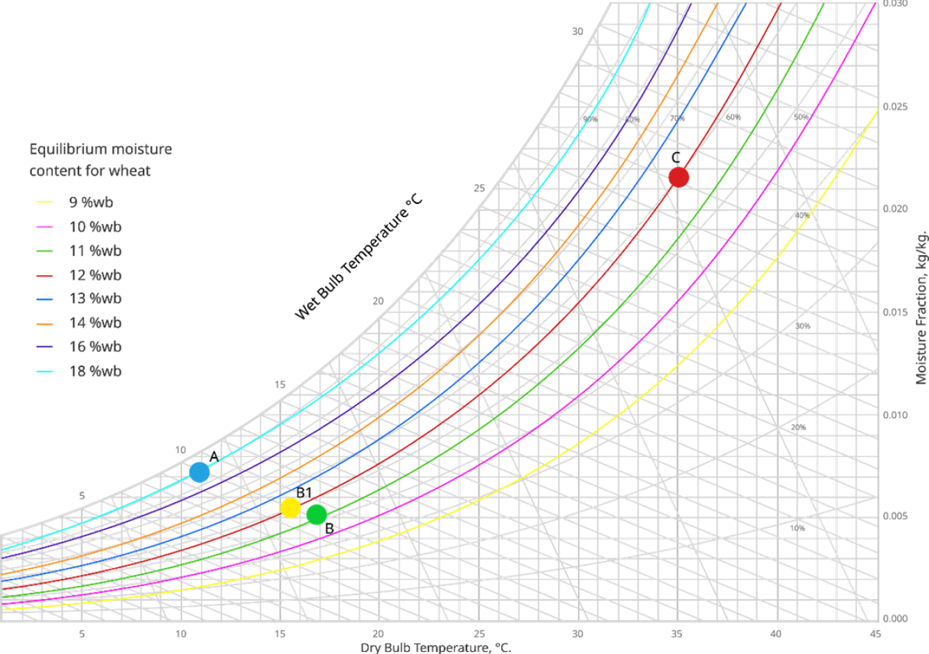 Figure 3- Psychometry diagram with different moisture values and equilibrium moisture content (EMC) curves for wheat (2) The temperature and relative humidity values in the zone C, are equal to the initial conditions in which the wheat was stored. Wheat in this region has a temperature of 35 °C and a relative humidity of 12%. Zone A has the same conditions with the air directed into the silo. When the condition of 11 °C (dry bulb temperature) and 90% relative humidity is marked on the psychometric diagram in Figure-3 (A), it is read that the temperature of the wheat in this region is 11 °C and the equilibrium humidity is 18%. For 11 °C (dry bulb temperature) and 90% relative humidity, the wet bulb temperature is read 10 °C on the curve. This is also the saturation temperature of the air. In order to calculate the values of the grain in the B zone, the wet-bulb temperature curve in the diagram is matched with the grain moisture equilibrium curve. The temperature read at the intersection point is 15.5 °C. (B1) For a more detailed estimation, the rule that the grain internal moisture balance changes by 1% for every 28 °C temperature difference is applied. By applying this rule, the humidity of zone B is approximately 0.70% ((35-15.5)/28=0.70) lower than zone C is calculated. In this case, the equilibrium moisture content of the grain for the zone B is 11.3% (12-0.7=11.3). In the diagram, the dry bulb temperature is 16.7 °C for 11.3% on the wet bulb curve. Thus, it is seen that the temperature of the wheat for the B region is 16.7 °C and the equilibrium humidity is 11.3%. With lower airflow rates, the cooling zone between the leading and trailing edges becomes thinner. When air flow rates are higher, the cooling zone becomes wider or thicker due to the reduced contact time of each air particle with an individual grain core. Since the moisture front closely follows a constant air enthalpy (parallel to the wet bulb temperature), wet bulb temperature is considered a more satisfactory criterion than dry bulb temperature for the control of grain aeration systems. [4] The cooling time of the grain, stored in the silo, to the desired temperature depends on many variables. However, a simple calculation method that can make an approximate time prediction was introduced by Navaro and Calderon [4]: F= (M x ΔT x C) / (Q x ρw x CF x ΔH) F: Cooling time (h) M: Mass of stored grain (kg) ΔT: The temperature difference between the initial condition of the stored grain and the cooled grain (°C) C: Specific heat of stored grain (kcal/ (kg °C) Q: Air flow rate over the stored grain (m3/h) ρw: Average density of cooled air (kg/m3) CF: Correction factor for enthalpy (0.4 ~ 0.5) ΔH: Maximum enthalpy difference between the air entering and leaving the silo (kcal/kg) Using this method, an approximate cooling time can be calculated for the grain, stored inside the silo. If it is proceed through the example;
