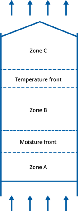 When air is passed over the grain inside the silo, 3 zones and fronts are formed in the silo. Figure 2 shows schematically the zones formed inside a silo, where the aeration process continues.