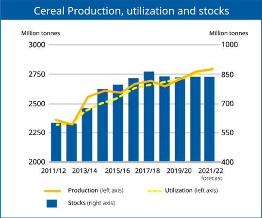 Figure-1: FAQ World grain production, consumption and storage forecast graph [1] On the other hand, the development of agricultural technologies has reduced the time between harvest and storage of grain from weeks to a few hours. In this case, the grain may need to be dried and cooled according to climatic conditions. Another issue is the cases where the grain is transported and stored again for long and even intercontinental transport under harsh conditions. In this case, since the grain is exposed to conditions that are very different from the ideal storage conditions, the balance of nutrients and moisture may be disturbed